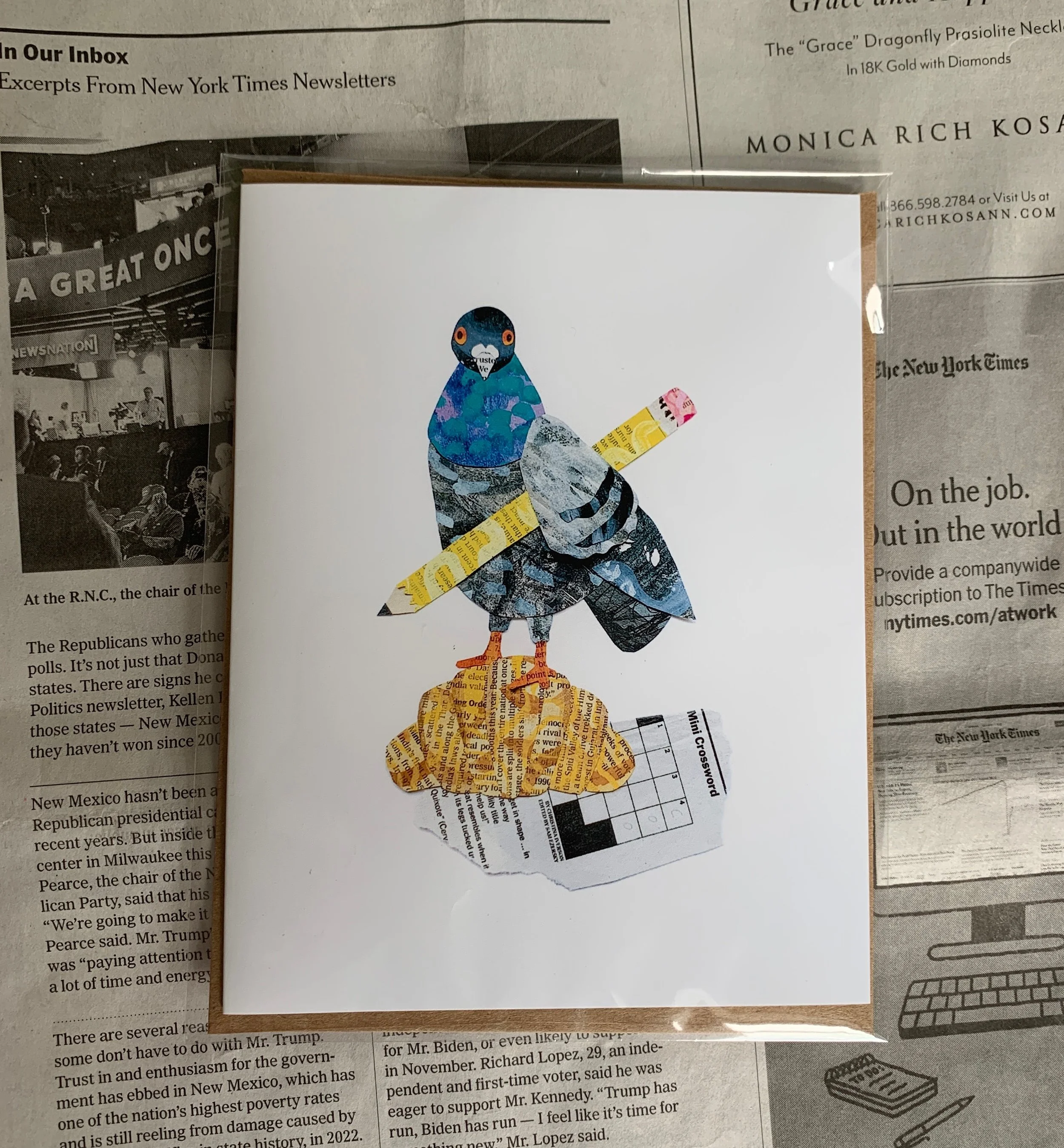It’s a pigeon! Standing on a croissant! Holding a pencil! Doing the crossword! On a greeting card! Yay mail!